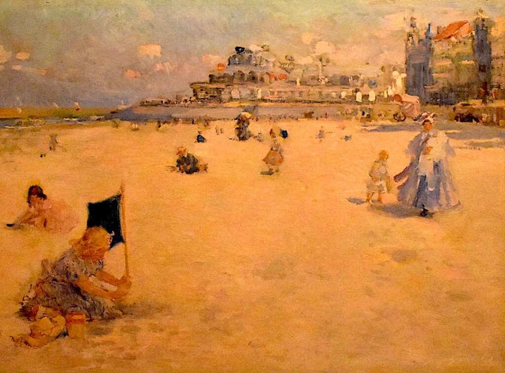 beaucoup, maintenant, en Belgique, mais plus heurtée, plus enlevée. C’est plein de choses grotesques, mais il y a là trois bonshommes, Caillebotte, Degas et Monet, qui sont d’une jolie force et très artistes », écrivait Félicien Rops, réalisant, lui-même, tardivement, en 1886, une toile inspirée de ce nouveau mouvement pictural, « La Plage de Heyst », exposée au 1er étage de la collection permanente du« Musée provincial Félicen Rops ».