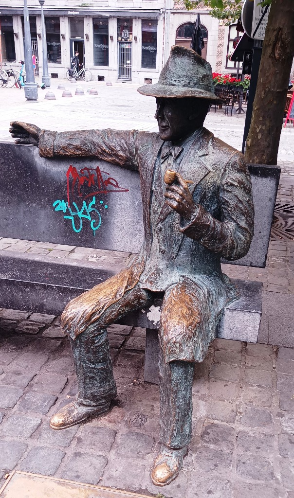 Juste à côté de la Place Saint-Lambert, rendez-vous derrière l’Hôtel de Ville (la Violette) où se trouve la statue de Simenon. Assis sur son banc, le fumeur de pipe invite les passants à s’asseoir un instant à ses côtés.