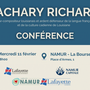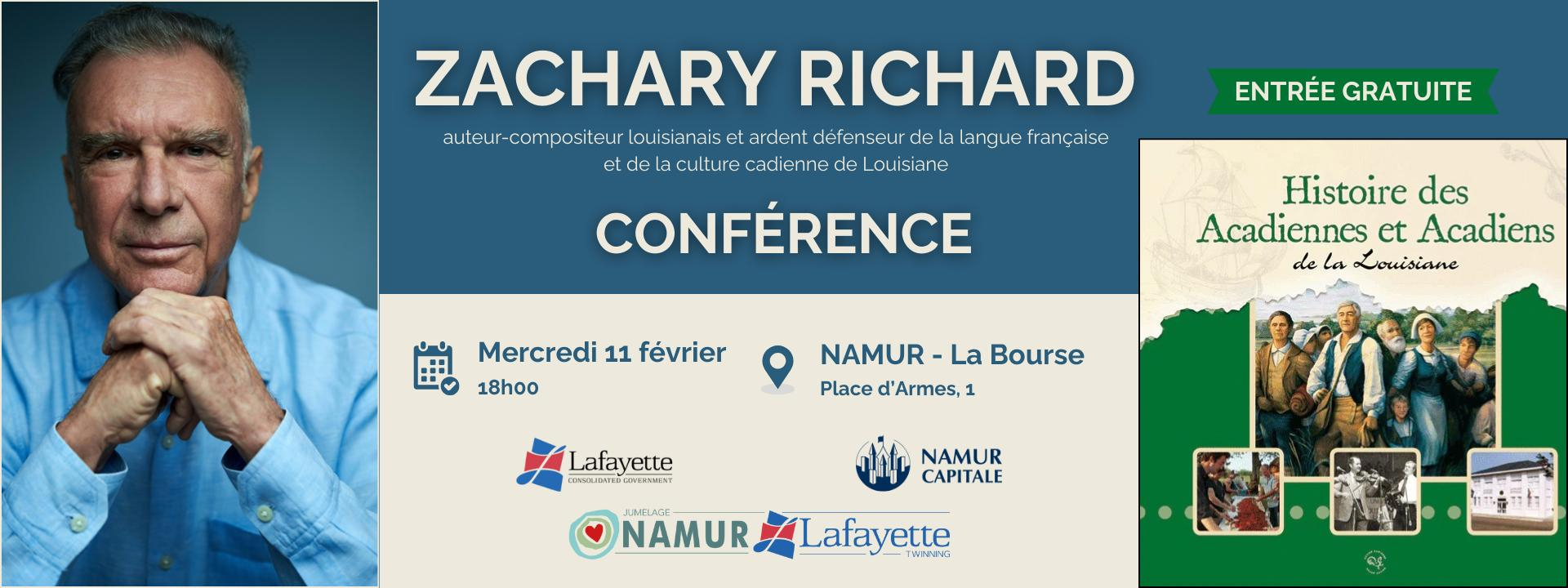 Dans le cadre du jumelage, en 1979, des Villes de Lafayette & Namur, venu en droite ligne du Sud des Etats-Unis, Zachary Richard (Ralph Zachary Richard/°Scott/1950) nous présentera son livre, “L’Histoire des Acadiennes et Acadiens de la Louisiane” (Editions « University of Louisiana »/2012/broché/146 pages), au cours d’une conférence éponyme, le mercredi 11 février, à 18h, dans les locaux de « La Bourse », sise sur la place d’Armes, à Namur.