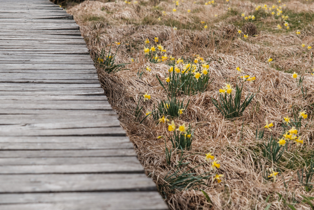 La Venntrilogie traverse trois régions, chacune en deux étapes. Les paysages des Hautes Fagnes sont caractéristiques des troisième et quatrième étapes. La troisième étape traverse pendant un certain temps le paysage paisible des tourbières hautes. La transition entre la forêt dense et le paysage typique Hautes Fagnes est fantastique. C'est comme si vous vous retrouviez soudainement dans un monde complètement différent. Vous le parcourez au gré des caillebotis avec tout autour une végétation très particulière. J'ai pu voir ici des jonquilles jaunes à la fin du mois d'avril.