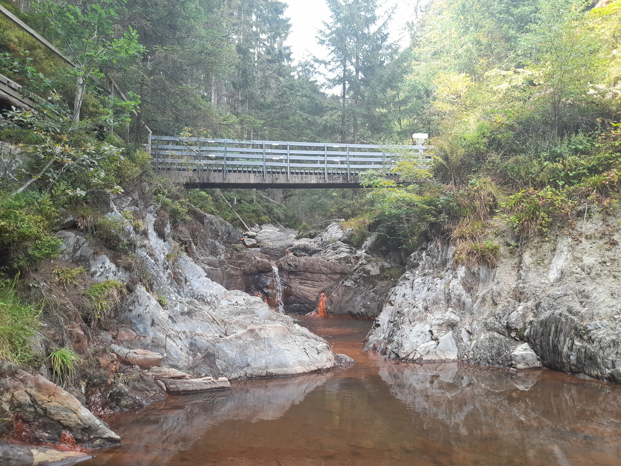 La Venntrilogie nous réserve encore bien des surprises. Au cours de la quatrième étape, j'ai admiré une cascade très particulière. On l'entendait et on la voyait déjà depuis le chemin, mais pour l'atteindre, il faut encore faire une courte descente très raide sur des rochers. L'eau tombe de très haut. Je me suis sentie conviée à m'attarder ici et j'ai presque perdu la notion du temps.