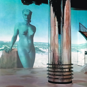 … Et nous voici arrivés dans la grande salle immersive, où des transatlantiques aux couleurs des oeuvres de René Magritte (1898-1967) nous attendent. Confortablement installés, nous profitons d’un spectacle de 35 minutes, retraçant l’évolution de l’art du peintre belge, dans une impressionnante rétrospective visuelle.
