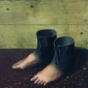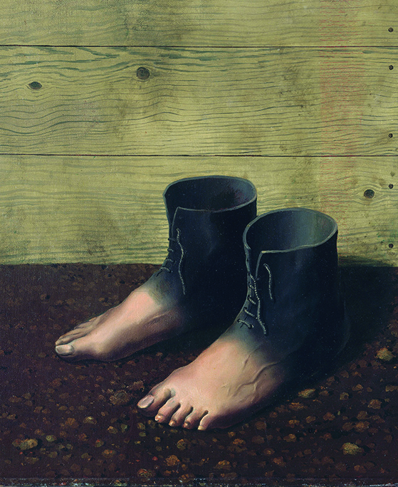 Il peut donner vie à des objets, comme cette chaussure en cuir qu’il peint avec des doigts de pieds en pointes des deux chaussures, l’intitulant : « Le Modèle rouge ».