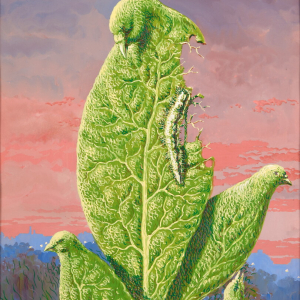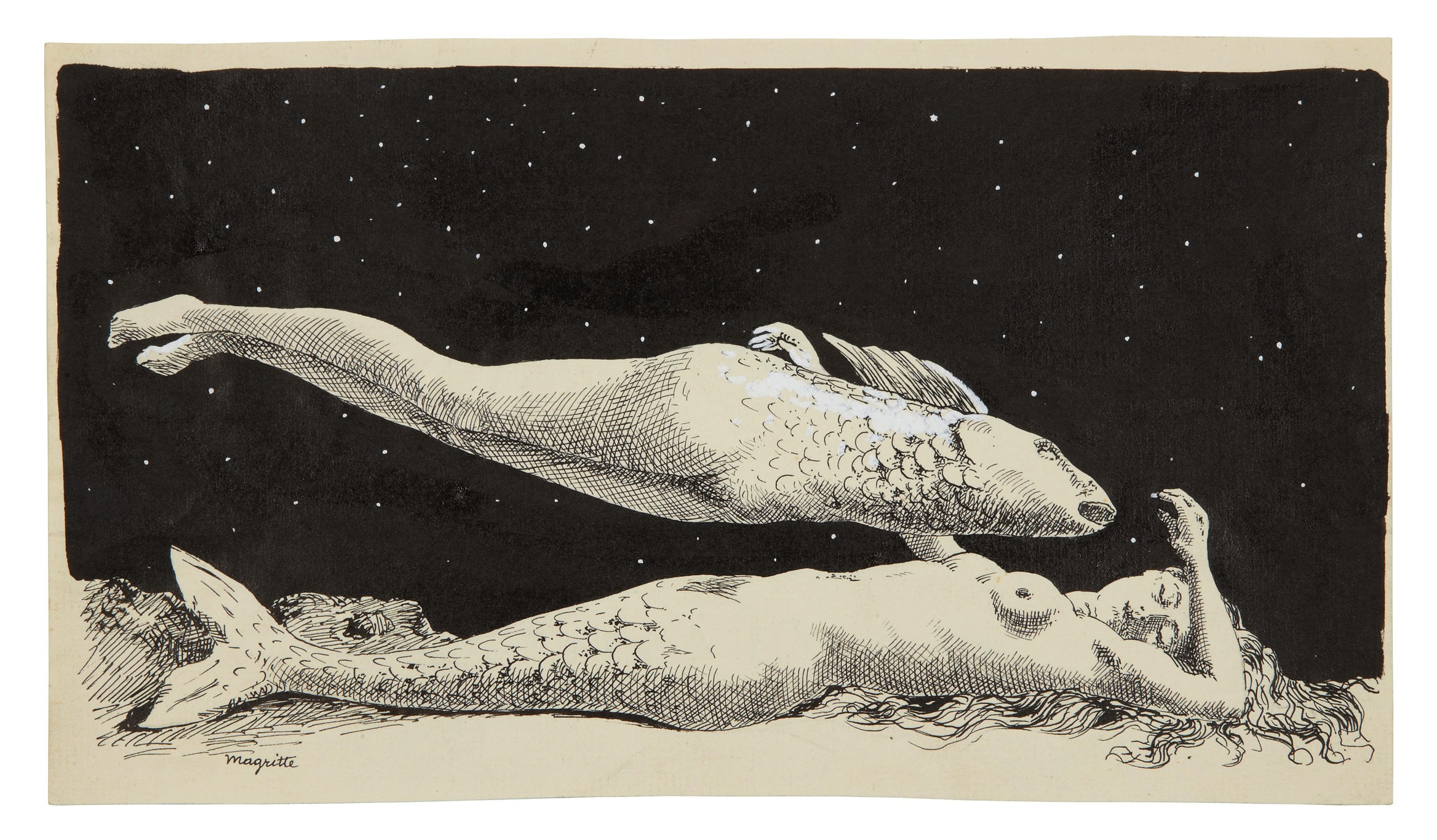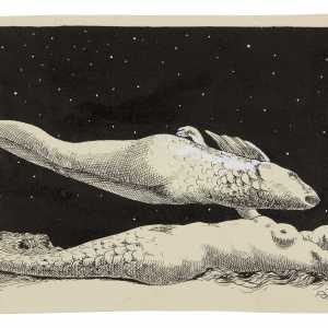 Quant à la dernière de ses oeuvres exposée, elle nous révèle deux femmes-poissons, l’une avec un corps de femme au-dessus de la ceinture & de poisson en-dessous, la seconde femme-poisson inversant cette représentation.