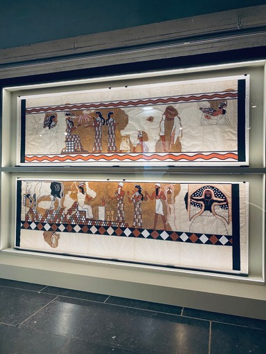 Au sein de ce cette exposition, nous trouvons, également – outre des copies de lettres et de laissez-passés d’archéologues -, des restitutions de peintures murales et trois calques reproduisant, grandeur nature, ces peintures murales de la « Chapelle 132 » du Grand Palais royal, présentés pour la première fois au public, le « Musée de Mariemont » ayant financé et réalisé la restauration (finalisée en 2022) de ces seuls témoignages que nous possédons de ces peintures illustres, désormais disparues.