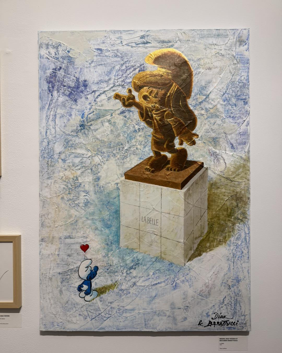Souhaitant qu’une oeuvre originale, à quatre mains, a été créée pour la présente exposition. Sur une peinture de son ami Riccardo Barattucci (°La Louvière/1973), Miguel Diaz Vizoso ajouta deux dessins, un « Schtoumpf » amoureux admirant « La Belle », une sculpture dessinée de la « Schtroumpfette ».