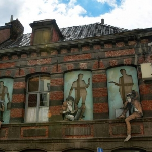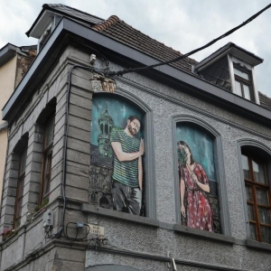 De l’autre côté de cette rue des Capucins, au numéro 63, c’est une maison abandonnée, aux fenêtes aveugles, rachetée par la Ville, qui est recouverte par une oeuvre terminée, « Le Miracle de Sainte-Waudru », du nom de la patronne de la Ville de Mons. Elle est due à un artiste parisien, à l’identité cachée, connu sous le pseudonyme (ou le nom de famille) d’ « Honet ». Evoquant la bande dessinée, cette iconographie religieuse est réalisée dans une « ligne claire« , chère à « Hergé »(Georges Remi/1907- 1983). L’oeil averti y verra, aussi, des symboles propres à l’artiste.