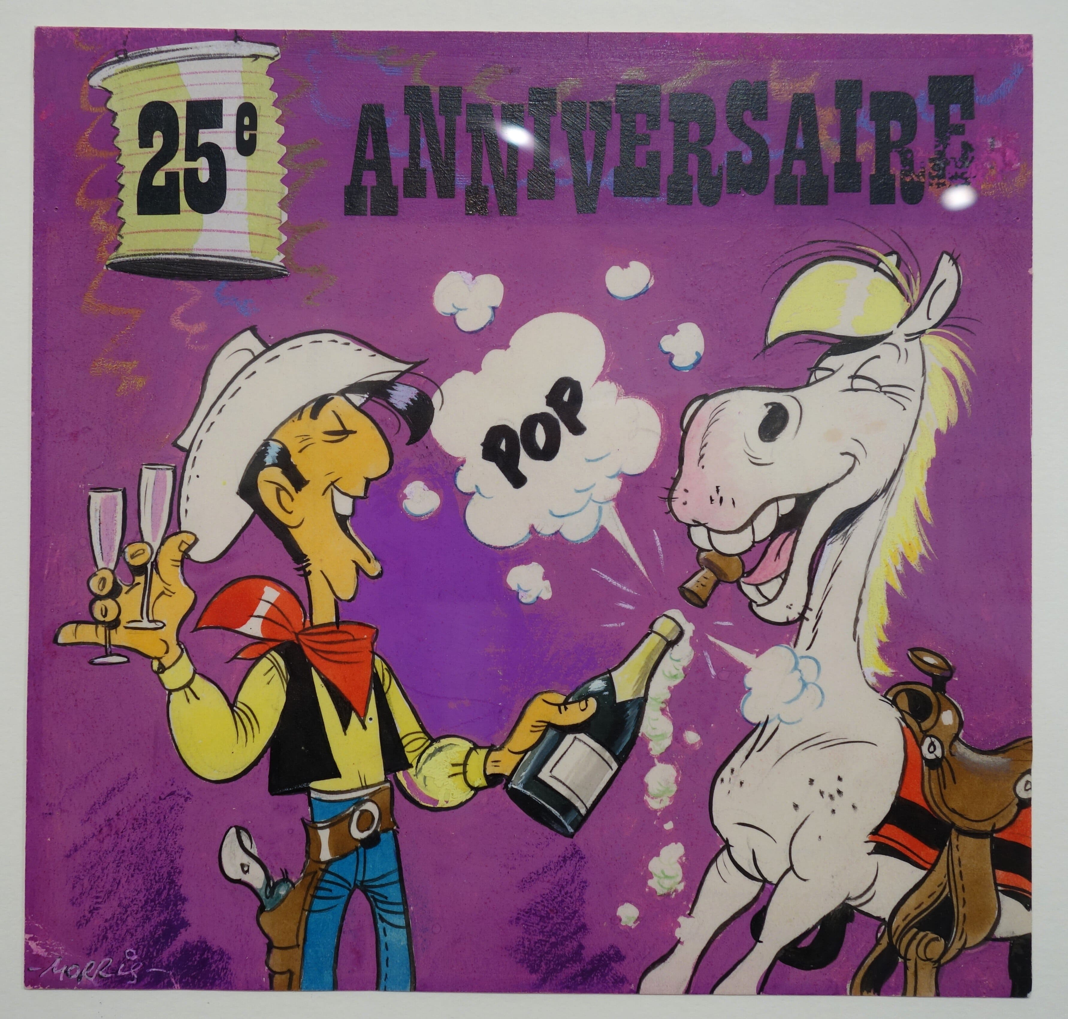 Cent planches originales sont à découvrir, disposées suivant l’ordre chronologique de leur création, Claude de Saint-Vincent (*Neuilly-sur-Seine/1952), directeur général de « Média Participations » – qui regroupe, entre autres, « Dargaud », « Dupuis » et « Le Lombard » – écrivant, en préface du catalogue de l’exposition : “Rêvant d’animation, passionné de cinéma, ‘Morris’ adopte l’archétype hollywoodien de l’époque, choisit un cow-boy comme héros et s’empare de l’univers du western.“