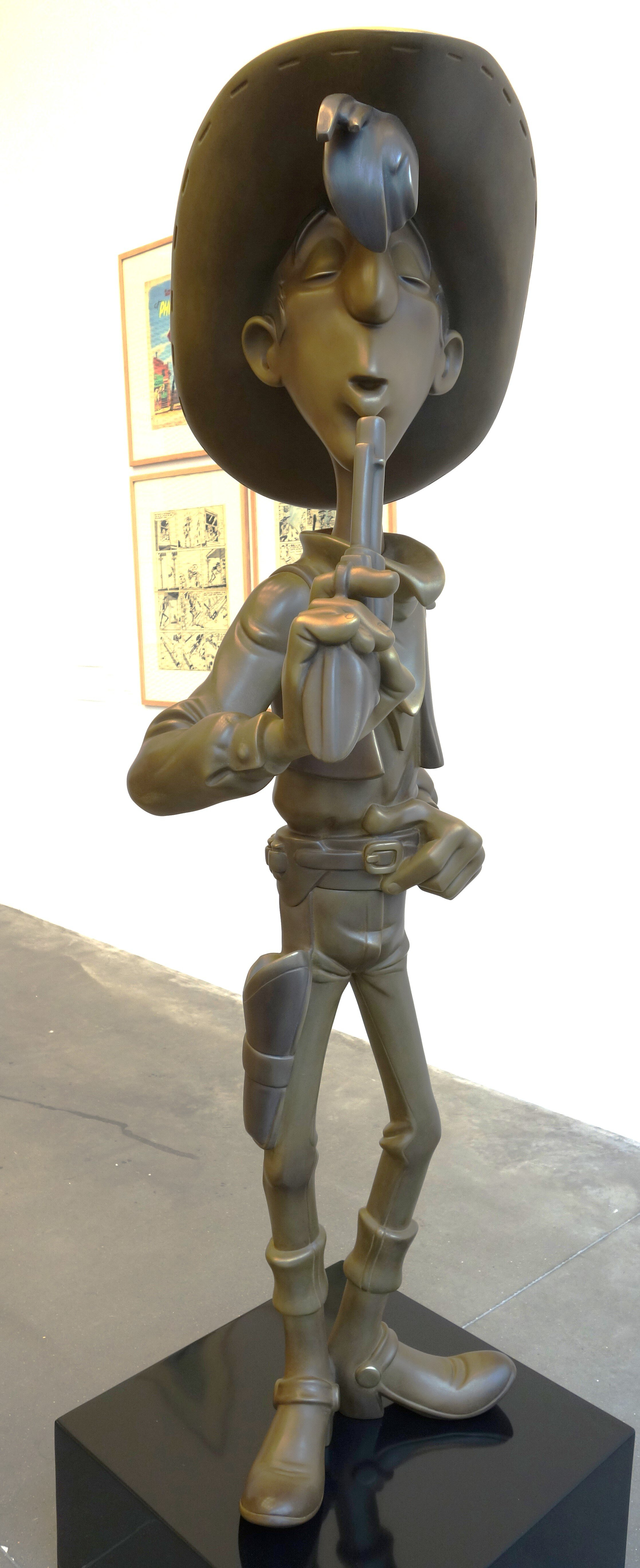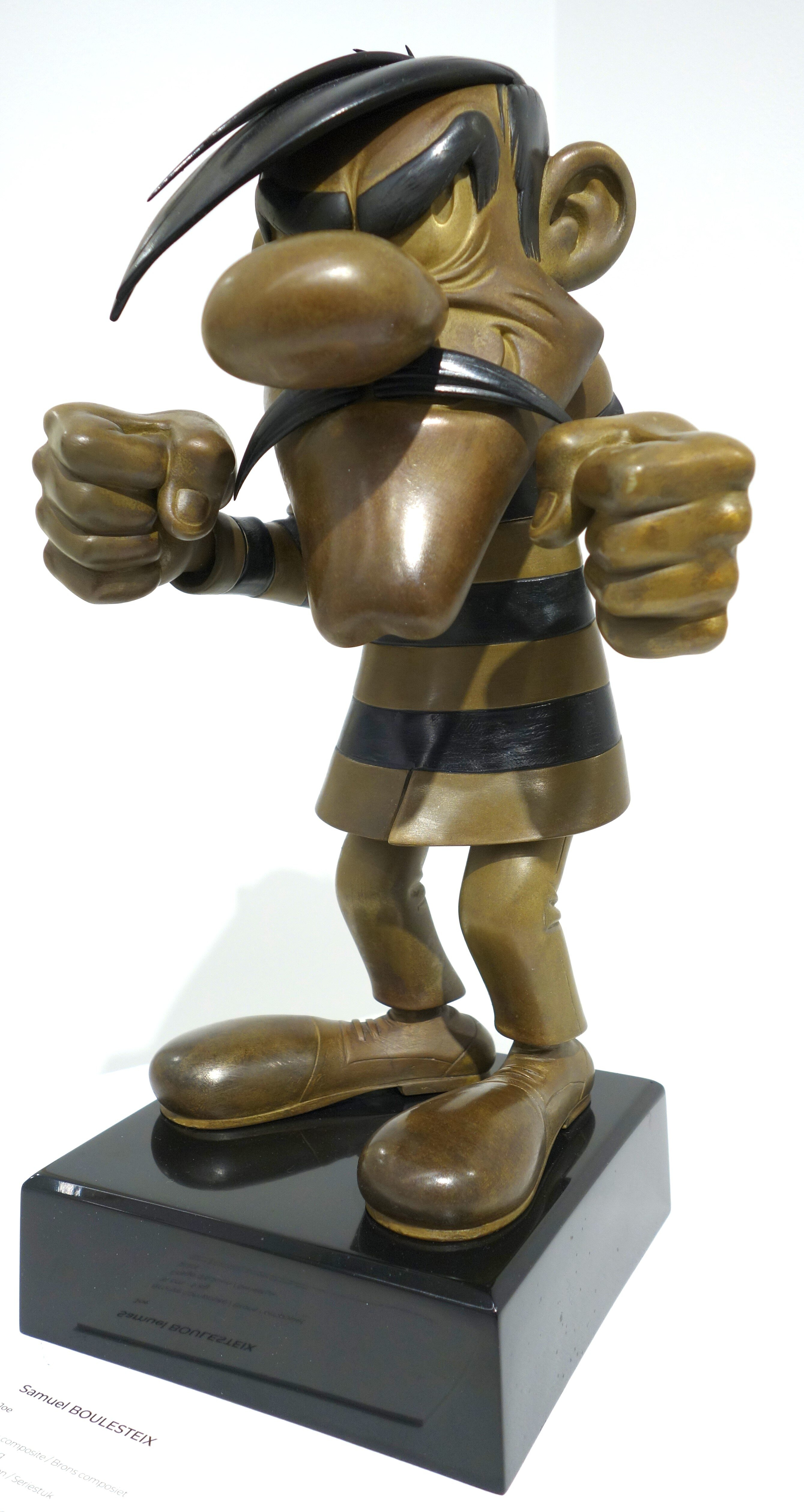 Dès l'entrée de la Galerie, nous sommes accueillis par des sculptures en bronze récentes de l'artiste français Samuel Boulesteix, qui écrit, concernant sa création de Joe Dalton : "Le dessin de 'Morris', duquel je suis parti- tiré de l'album "Ma Dalton" - m'a semblé le meilleur modèle pour une sculpture car j'avais envie de représenter 'Joe' au plus près de son caractère. Cette pose sans accessoires, ni aucune espèce d'action, est un moment de grâce, tout en suspens et en intériorité, l'occasion d'admirer toute la pureté de son machiavélisme."