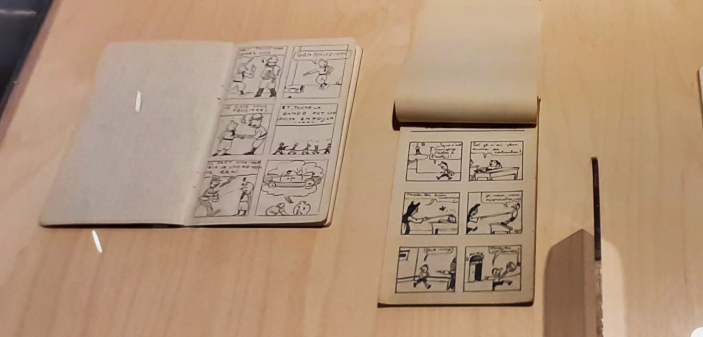 … Soulignant que nous pouvons découvrir 15 couvertures originales, jamais exposées, laissons à chacun le soin de parcourir l’exposition « Morris, 100 Ans, 100 Oeuvres », à son rythme, en lisant attentivement les cartels, nous emmenant vers la dernière salle, où – outre la projection d’extraits de l’émission française “Du Tac au Tac”, dans laquelle « Morris » évoque un peu plus sur son coup de crayon – nous voyons des tables vitrées, où nous pouvons, entre autres, découvrir des carnets de dessins d’enfance de Maurice de Bevere, le futur « Morris », l’un de ses carnets nous prouvant toute l’estime que ce grand dessinateur, en devenir, vouait à « Hergé ».