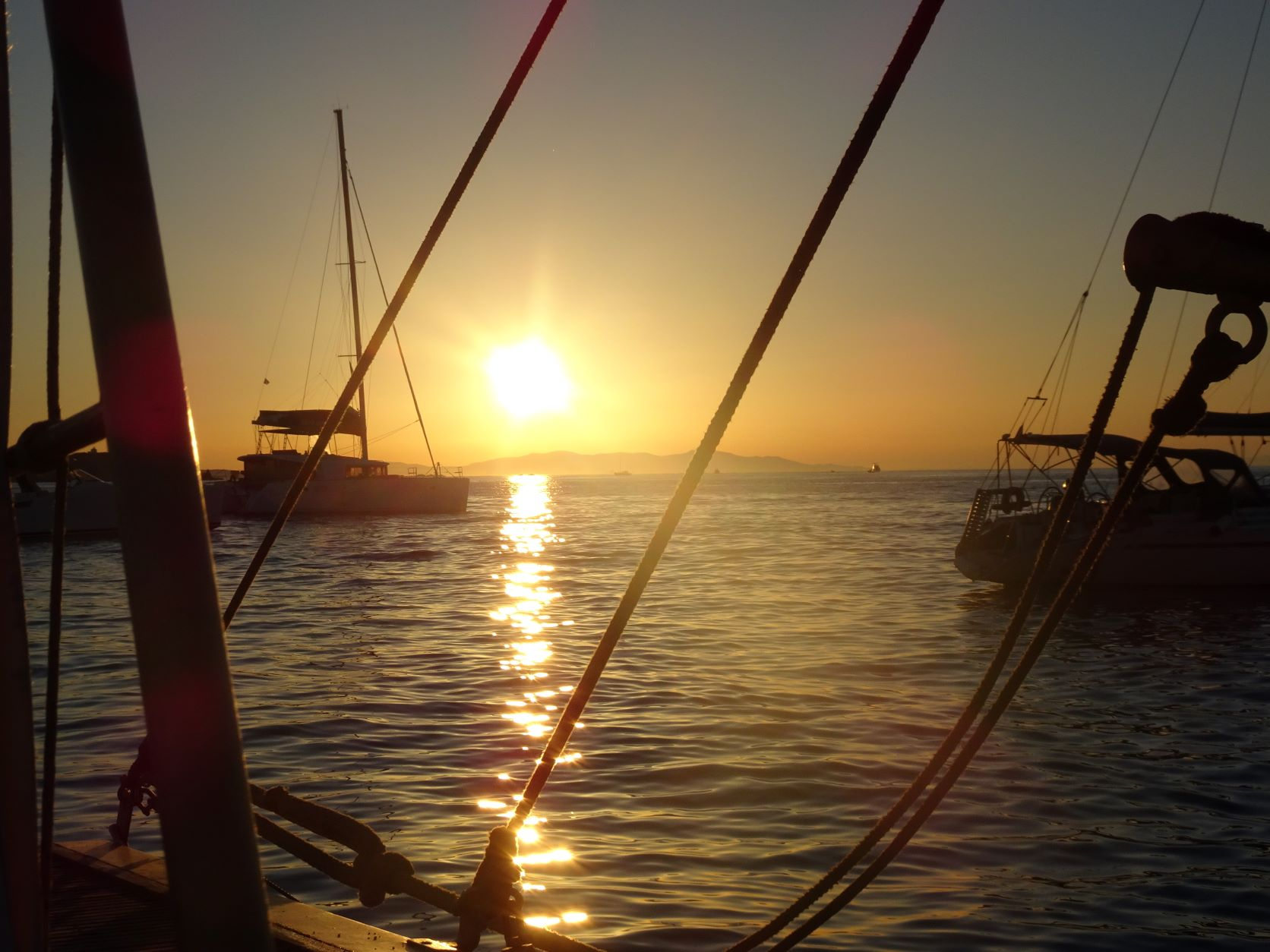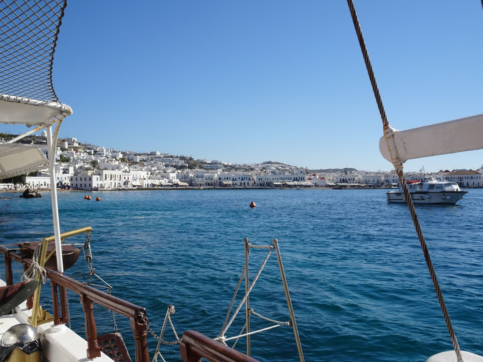 Un conseil : réservez une excursion en bateau vers Rineia et Délos, avec le coucher de soleil au retour vers Mykonos. C'est fabuleux ! Aegean Ventures organise cette escapade magnifique et très agréable au départ du port de Mykonos (près du grand parking public). Vous pouvez réserver chez Maroussa au kiosque de Aegean Ventures, une dame bien sympathique d'origine bruxelloise ou dans votre hôtel. Le capitaine était gardien dans l'île de Délos et avec sa famille, il propose cette balade inoubliable de 16h30 à 20h30. Un arrêt à Rineia permet de nager ou de se relaxer à bord. Le prix de 60€ comprend la traversée de 40 minutes et lors du retour, on vous sert un ou deux verres de vin, un snack léger et un cokctail peu avant le coucher de soleil. Un seul mot : à faire ou à refaire (www.aegean-ventures.com).