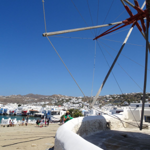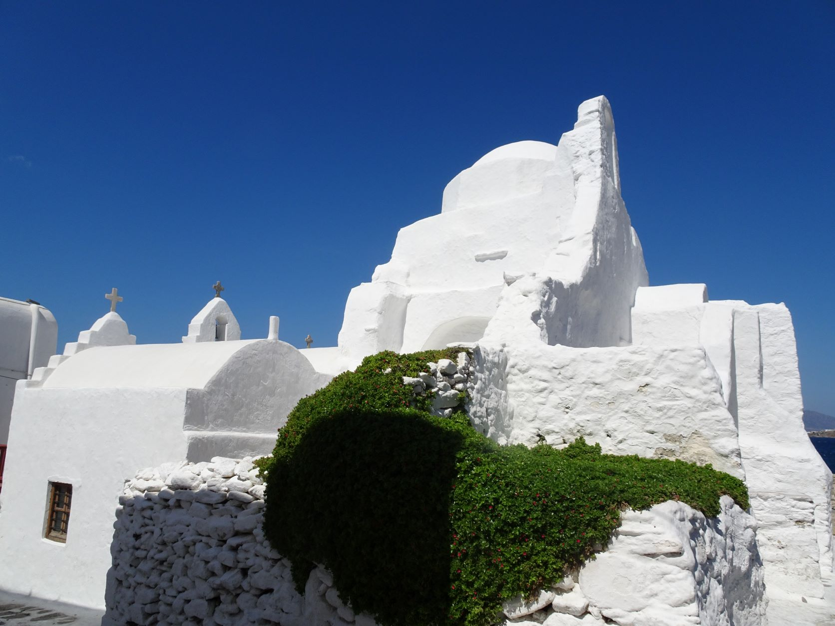 Six moulins dressent leurs ailes tronquées dans le ciel, rendu extraordinairement pur, par le vent de l’été, le meltem. Tout semble avoir été ordonné par un publicitaire de talent. Mykonos compte 365 chapelles et Paraportiani est le monument le plus photographié de l’île. Il s’agit d’un ensemble de quatre petites églises au niveau du sol et une à l’étage, qui est connue comme Paraportiani (parce qu’elle se trouve près de la petite porte –en grec, paraporti). Il parait que le groupe fut construit progressivement au XVIe et XVIIe siècles. Des fouilles sont effectuées près de Paraportiani ; il s'agit de restes d'un château médiéval.