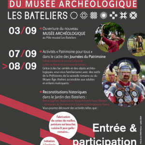 Ouverture du pôle « Les Bateliers » (« Musée archéologique » & « Musée des Arts décoratifs ») : du mardi au dimanche, de 10h à 18h. Entrée gratuite. Contacts : 081/24.87.20. Entrée gratuite. Site web : http://www.lesbateliers.namur.be.