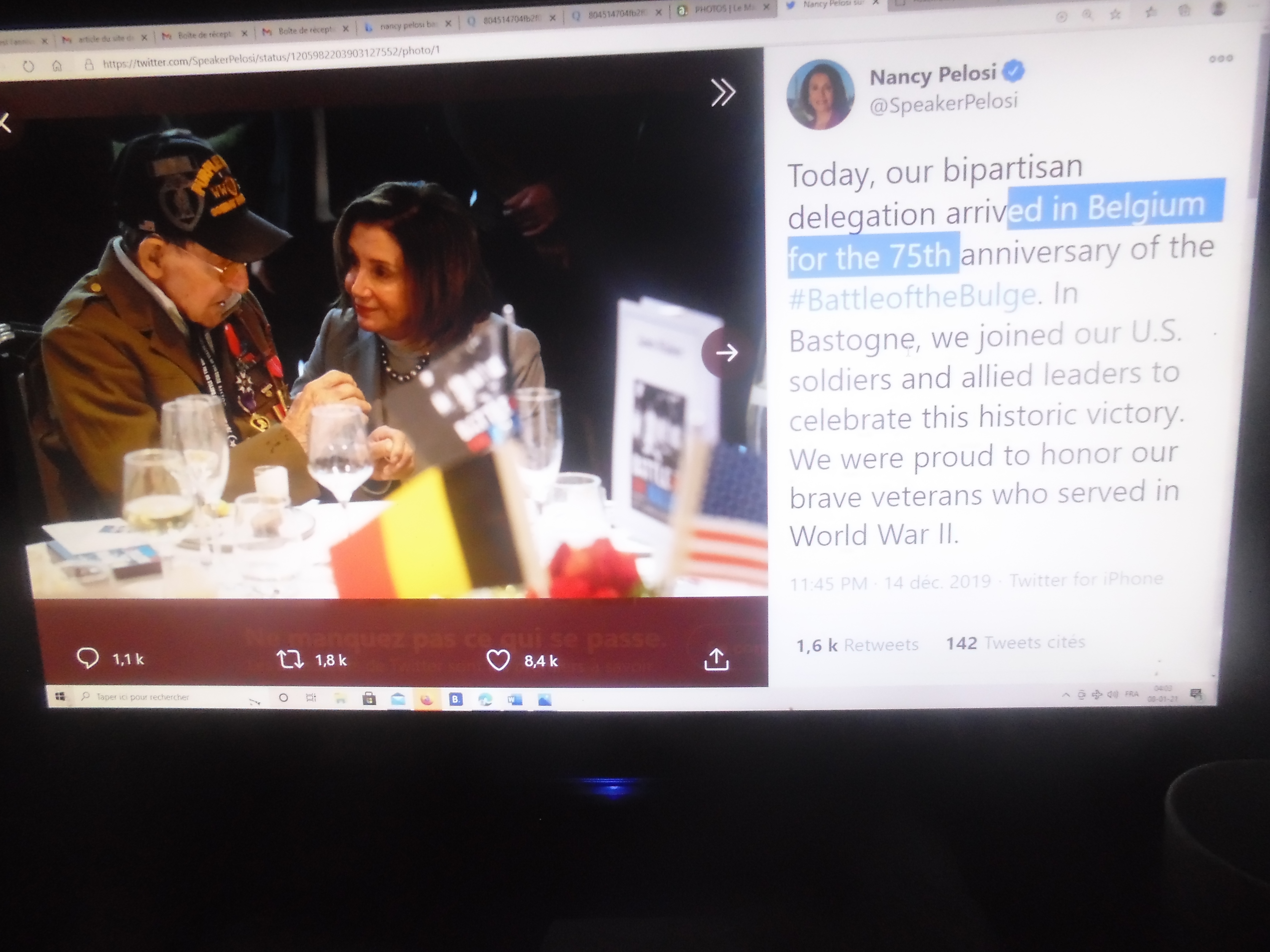 Présentation. Nancy Pelosi. Cette femme de 80 ans est devenue célèbre dans le monde entier comme cheffe des Démocrates américains, lors du saccage de son bureau au Capitole (06.01.2021). Quelques mots pour mieux connaître cette déléguée aux commémorations du 75e anniversaire à Bastogne.