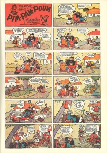 L’exposition parisienne est découpée en deux parties, le parcours débutant par des BD dont il était friand, tel « Pim Pam Poum », de Rudolph Dirks (1877-1968), qui sont à l’origine de son envie de réaliser, lui aussi, des bandes dessinées.