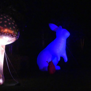 Ainsi, continuant notre balade nocturne, nous nous retrouvons, à deux reprises, devant de petits étangs, apercevant bientôt un petit manège, là où « Pinocchio » voit son nez et ses oreilles pousser, au risque qu’il ne se transforme en âne, alors qu’arrivant au second petit étang, nous voyons « Geppetto » installé dans une barque, voguant sur l’eau, sous une baleine volante, la séquence suivante, en partie circassienne, étant censée se dérouler dans le ventre de cette dernière, comme le veut le récit imaginé par Carlo Collodi.