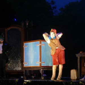 Tout commence, assis devant une première des neuf scènes du spectacle itinérant, à l’entrée du domaine de Beloeil, « Geppetto », sculpteur sur bois, se promnène parmi les enfants, manipulant sa création, une marionnette, à qui il donna le nom de« Pinocchio ».