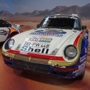 Plus loin, dans un décor de désert, nous trouvons quatre « Porsche » ayant participé au « Paris-Dakar », dont la « Porsche 959 », qui, pilotée par Jackie Ickx et l’acteur français Claude Brasseur (1936-2020), premiers en 1983, se classèrent seconds, en 1986, derrière un autre équipage « Porsche », composé des pilotes français René Metge (°Montrouge/1941) & Dominique Lemoine, cette édition du « Paris-Dakar » ayant traversé le Niger, la Guinée, la Mauritanie et le Sénégal, sur un parcours de 13.600 km.