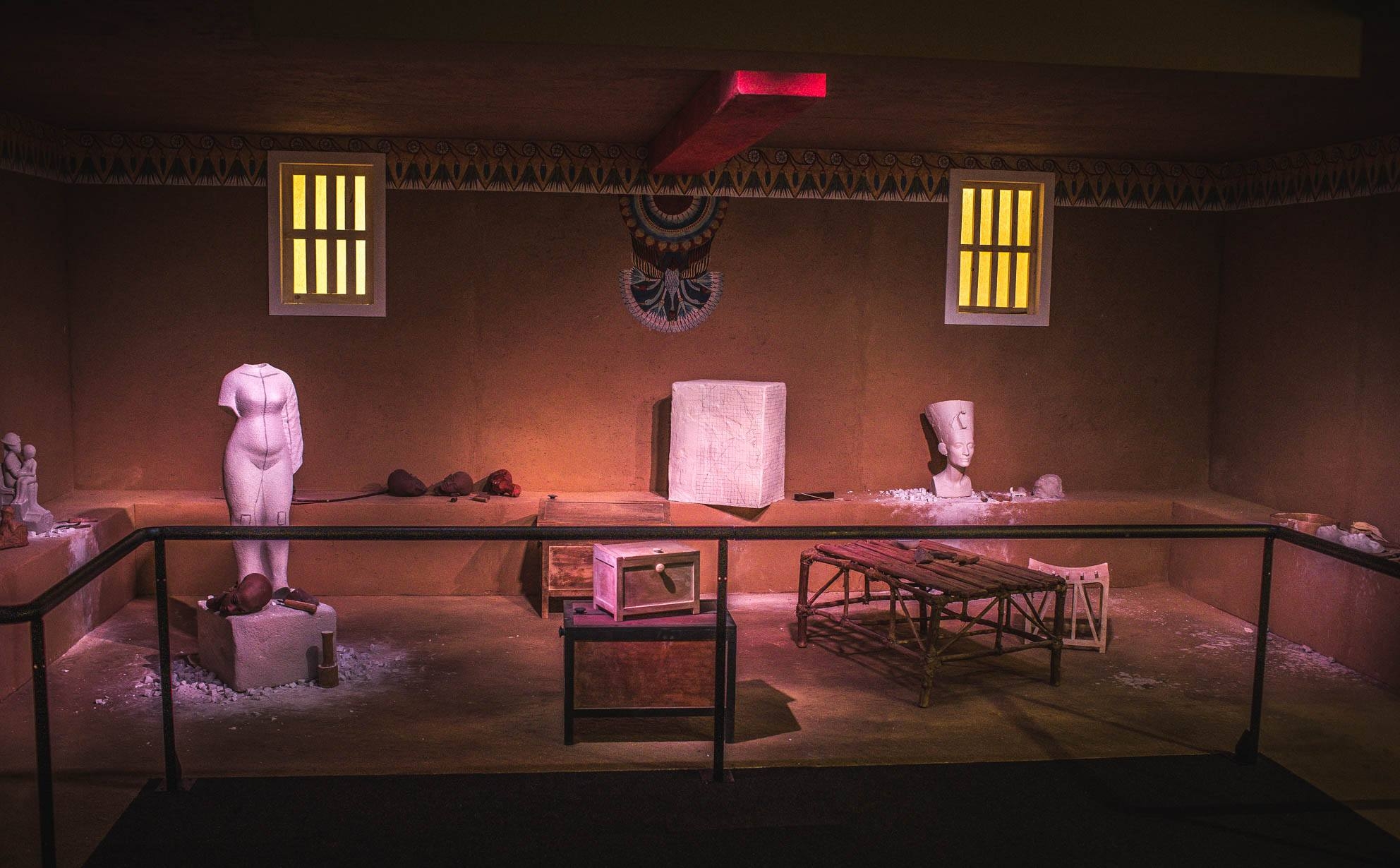 Parmi les décors créés par« Europa Expo », notons encore la reconstitution d’un atelier de sculptures, sis à Armana, la ville où Toutankhamonvécut son enfance, celui de Thoutmôsis, sculpteur officiel du Pharaon Akhénaton (circa -1371/ -1337), le père de Toutankhamon. C’est àThoutmôsis que nous devons le célèbre buste – dont l’original se trouve à Berlin, au « Neues Museum » – de la Reine Néfertiti (circa -1370/-1333), la mère présumée de Toutankhamon, l’exposition évoquant qu’une certaine « young lady », parmi 16 momies féminines expertisées, aurait pu enfanter ce Pharaon, décédé à 18 ans, dans des circonstances inconnues.