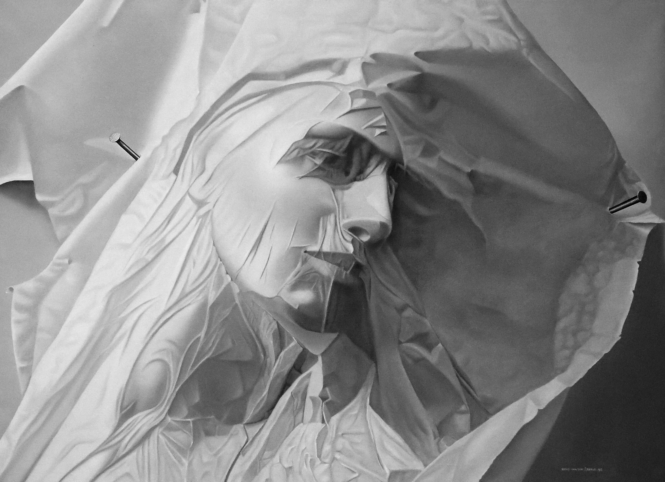 Ses fonds brunsvont s’éclaircir jusqu’au blanc pur. Dès lors dans cette période blanche, les thèmes vont se succéder et se différencier. A présent, ce sont les femmes surtout qui honorent l’univers de l’artiste. Leurs corps, leurs mains, leurs visages s’y installent et côtoient quelques dérisoires papiers imprimés.