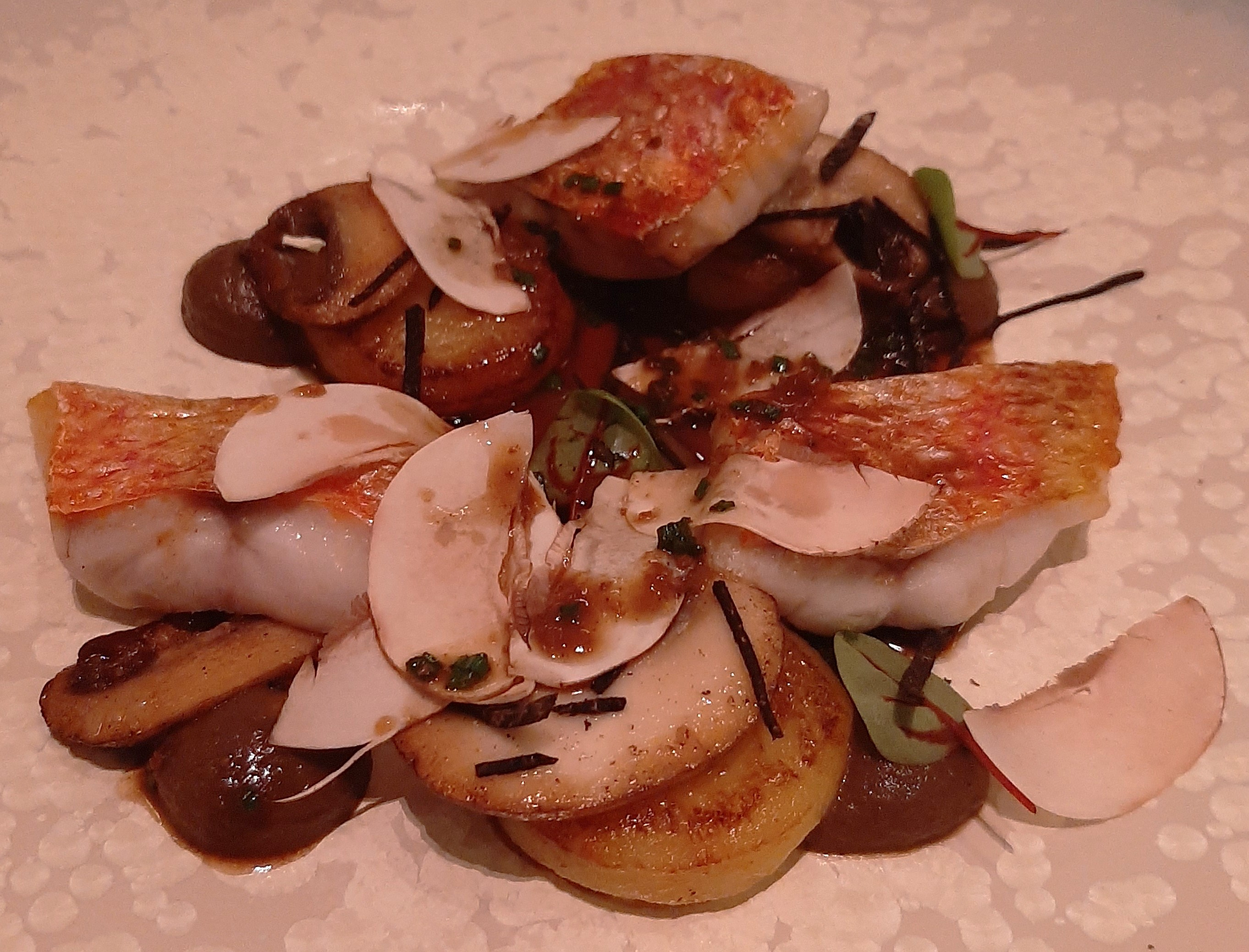 3/ Rouget de méditerranée, avec soncondiment d'aubergines et sa sauce "Bécasse", accompagné d’un Côte de