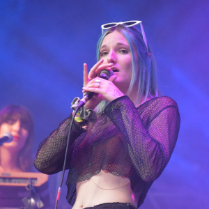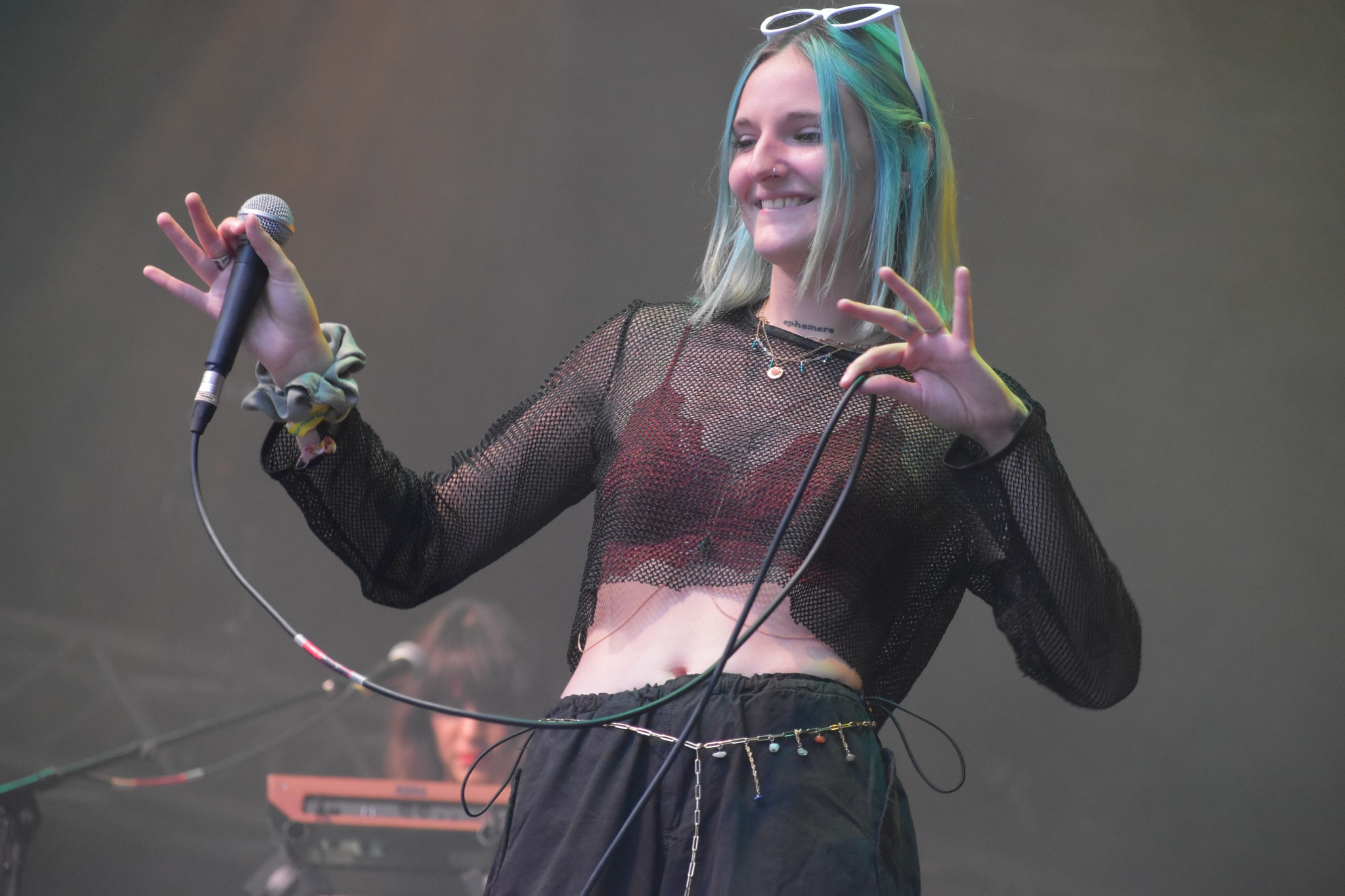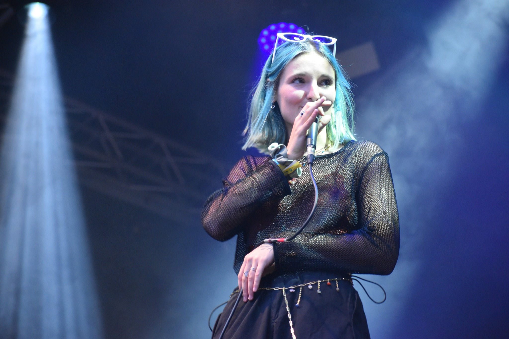 *** Sur cette même scène, à 19h45, nous accueillions la conviviale chanteuse-guitariste belge, aux cheveux bleutés, Doria D (Doria Dupont/°Louvain-la-Neuve/2000).