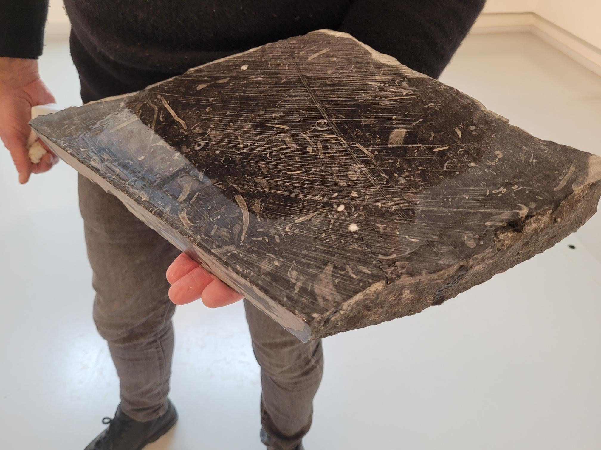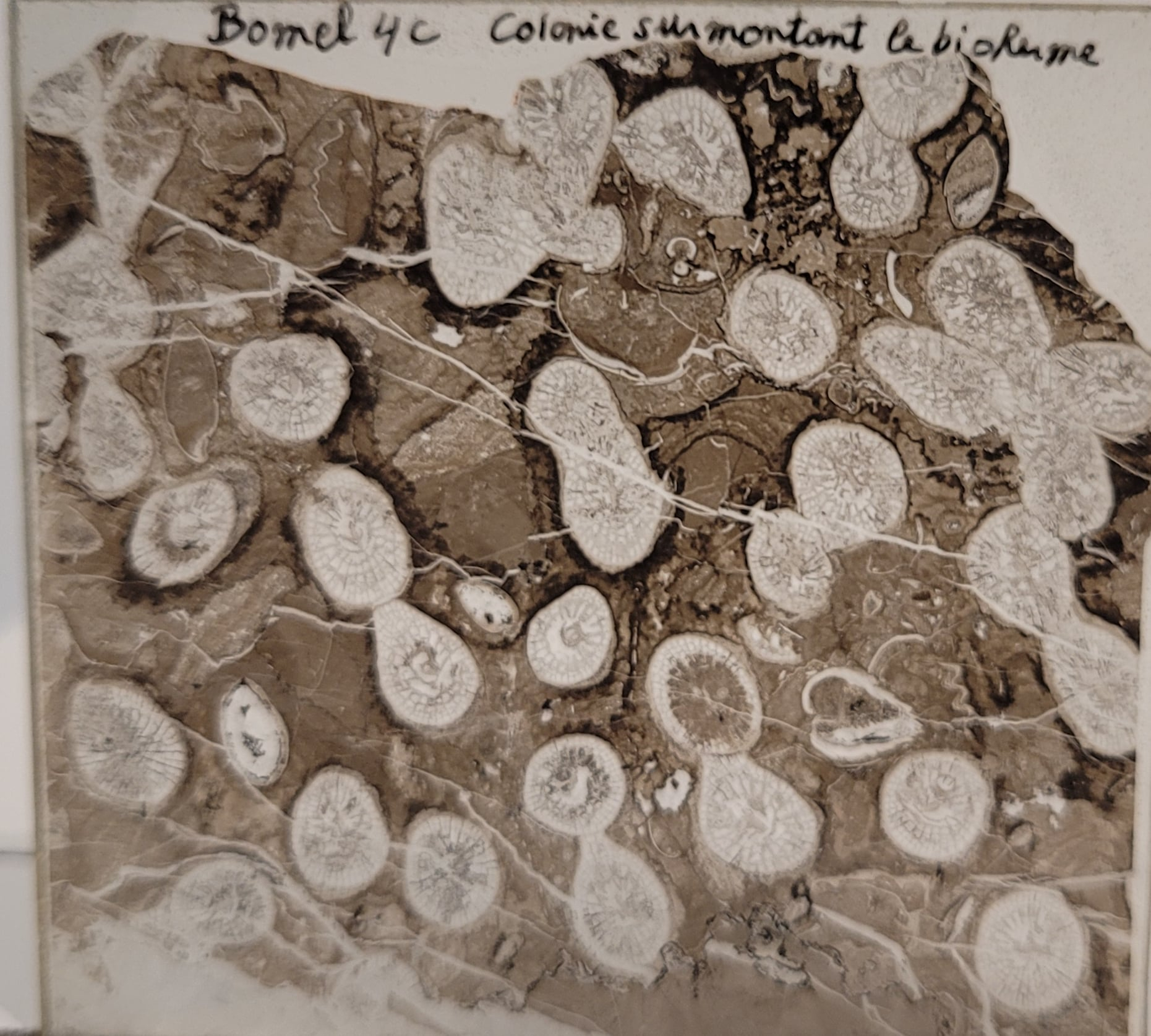Un jeu double se construit : une référence aux formations géologiques portant des fossiles incrustés d’autres cycles de vie disparus et un lien au lieu ; les carrières voisines.