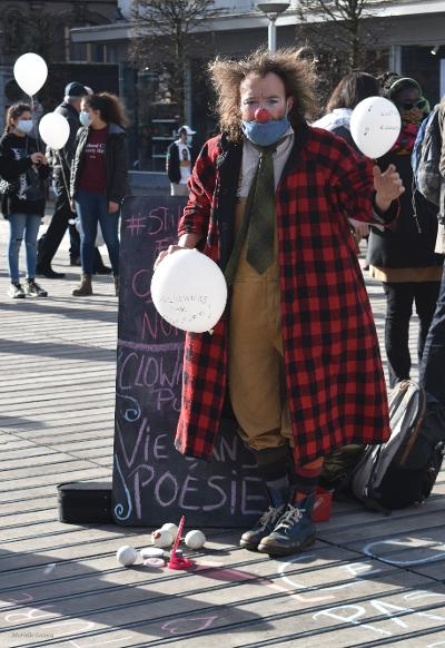 ➤ En formant des files d’attente (seuls rassemblements non interdits à l’heure actuelle) devant des lieux culturels, des salles de sport ou des auditoires d’Université fermés. En investissant ces files de paroles, de sons, d’images…