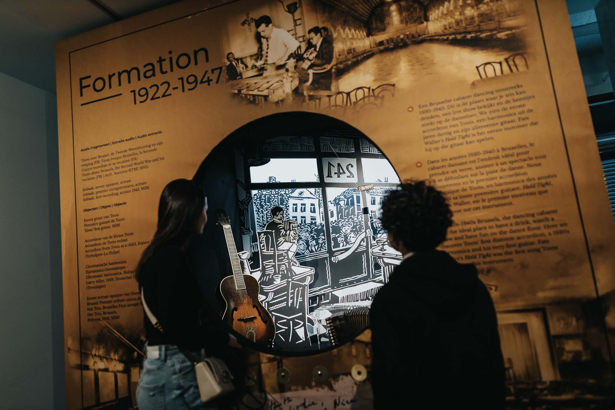 Grâce à une paire d'écouteurs, nous pourrons suivre toute la carrière de Toots, écoutant de nombreux extraits musicaux, aussi bien que la voix, en anglais, en néerlandais et en français, de cet inoubliable "ketje des Marolles".
