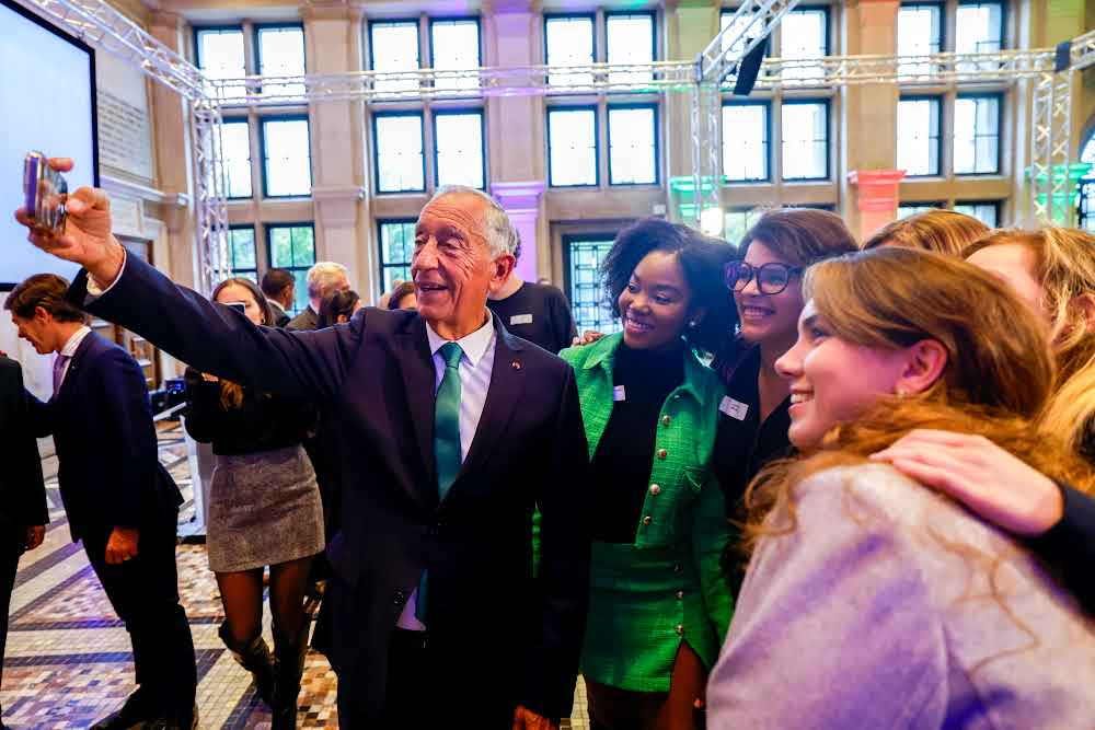 Empruntant le tapis rouge, le Président alla, en toute convivialité, à la rencontre d'une vingtaine d'étudiant.e.s portugais.e.s, du programme "Erasmus" et belges, Acceptant qu'une étudiante le photographie avec elle, en "selfie". Ayant pris le temps de s'entretenir quelque peu avec tous.tes les étudiant.e.s, il revint sur ses pas, utilisant son propre smartphone pour réaliser, avec une extrême amabilité, un "selfie" personnel avec chaque étudiant.e