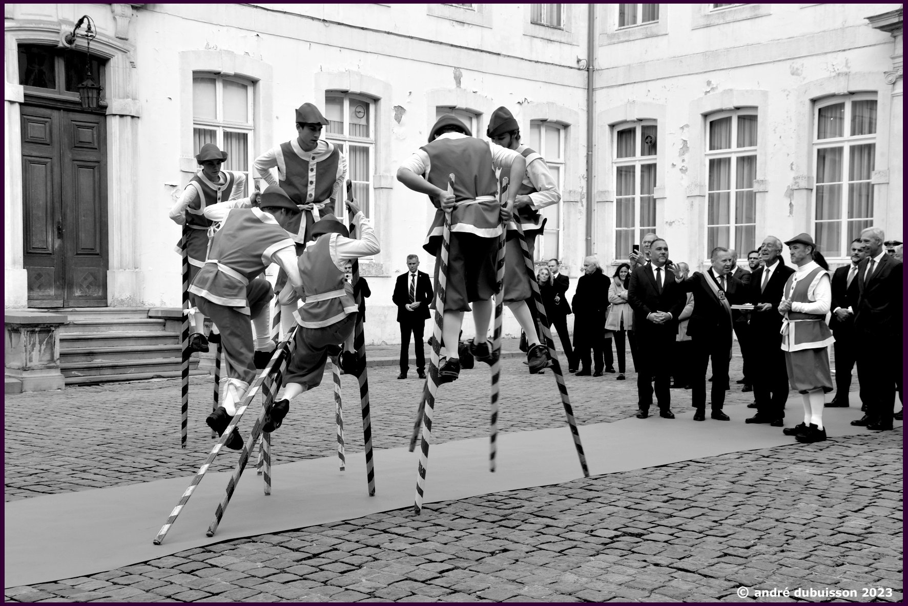 Après une réception, offerte par le Gouverneur, la délégation retraversa la cour d’honneur, écoutant la chorale d’enfants des « Jolies Notes » interpréter l’hymne des échasseurs namurois, alors que ces derniers leur offrirent un court combat, les « Joutes sur Echasses de Namur » figurant, depuis 2021, sur la liste du « Patrimoine culturel immatériel de l’UNESCO ».