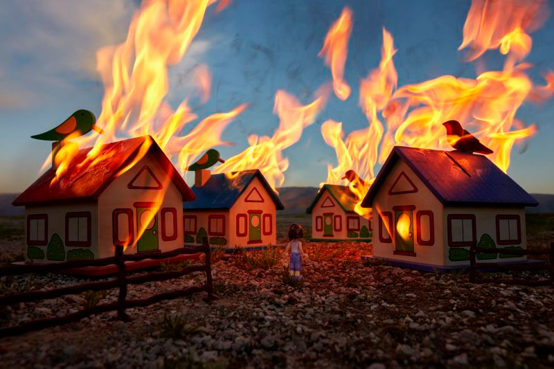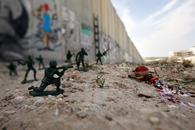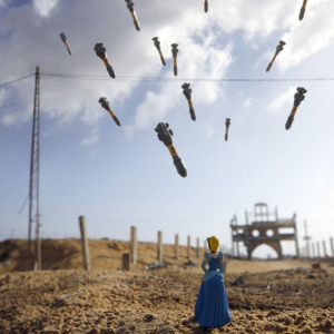 Egalement, ils évoquèrent les tentes et les camps, au sein desquels ils survivent, de leurs espoirs d’écoles, de terrains de jeux, d’une vie meilleure. Fort de ces dessins d’enfants et de leurs récits, depuis 2011, Brian McCarty recompose, sur les lieux mêmes de ces drames – les matérialisant, en quelque sorte -, ces scènes, qu’il photographie ensuite, se plaçant sur le seul point de vue des enfants, ayant intitulé « War-Toys », cet intéressant projet photograhique.