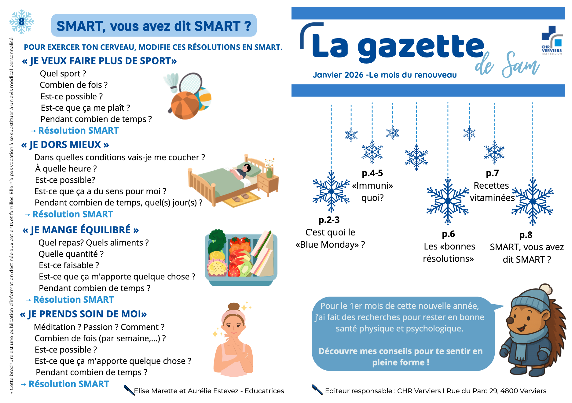 Chaque mois, Sam se décline dans un magazine ludique et coloré, conçu à l’attention des enfants et de leurs parents. À travers des informations vulgarisées, des jeux, des conseils pratiques et des astuces du quotidien, le magazine aborde des thématiques variées liées à la santé, au bien-être et à l’hôpital de manière rassurante, accessible et positive.