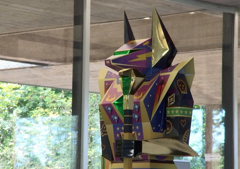 A gauche, "Anubis" (2022), une oeuvre de Ian Kirkpatrick © "Musée de Mariemont"