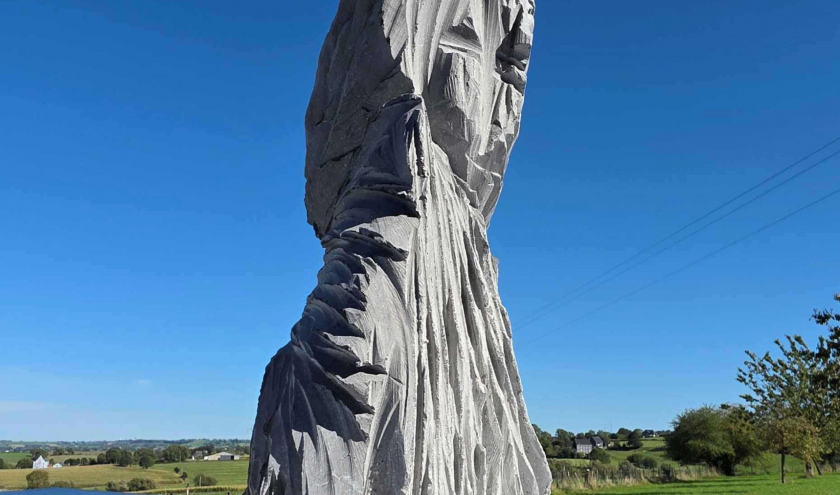 Les sculptures, à la fois douces et tranchantes, sont réalisées à partir de pierre bleue belge, un calcaire de chez nous vieux de 350 millions d'années, formé à partir de fossiles marins.
