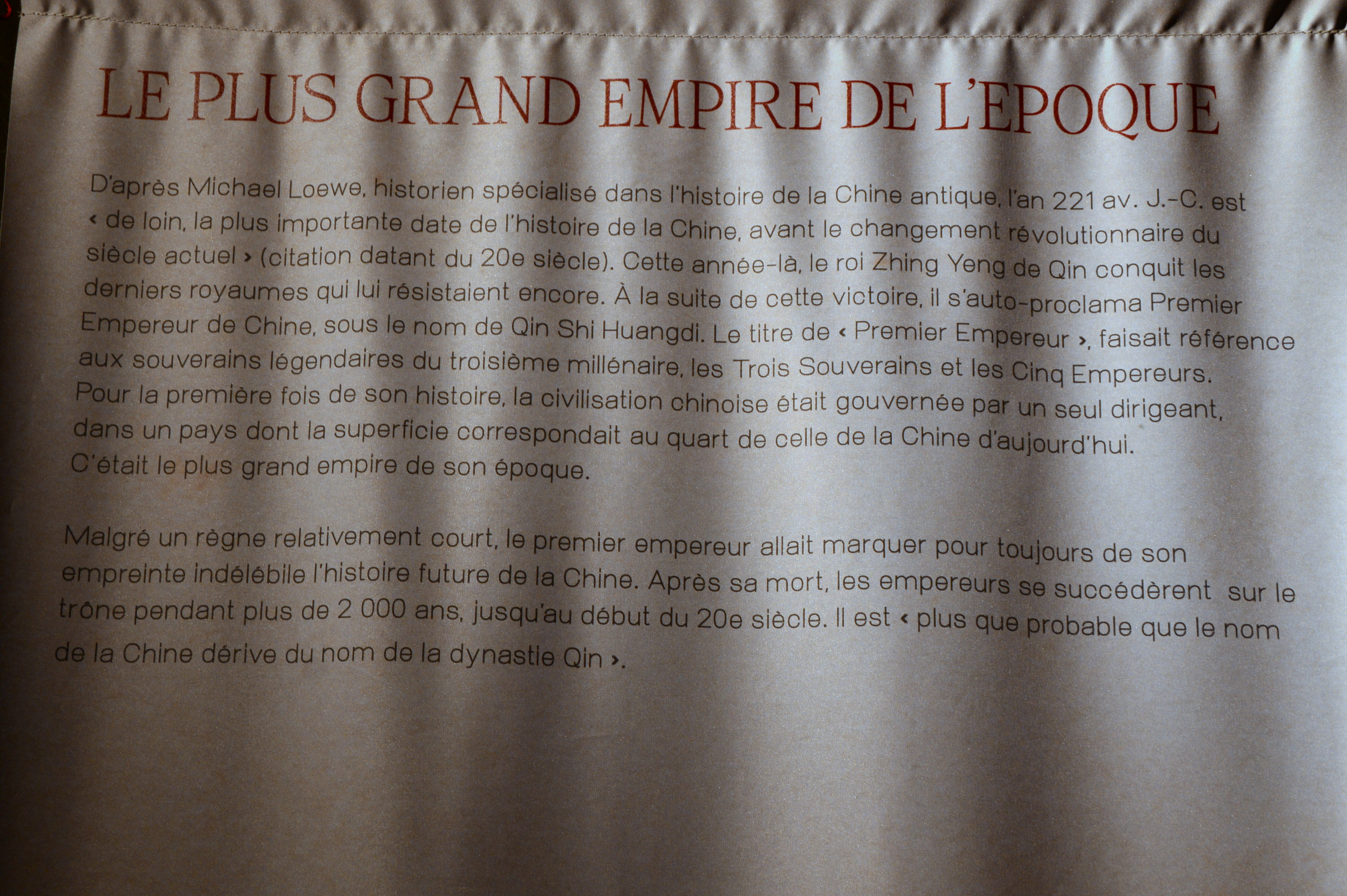 Venant des foules à Naples en 2017 et à Milan en 2019 avant d'atteindre la capitale belge, il est présenté comme « l'exposition la plus complète » jamais créée sur l'armée, la nécropole et la vie du Premier Empereur de Chine. Son nom, Qin Shihuangdi (259-210 av. J.-C.), signifie littéralement « premier empereur ». La dynastie n'a duré qu'environ 15 ans, de 221 à 206 av. J.-C., mais elle a grandement influencé les 2 000 prochaines années de l'histoire chinoise.