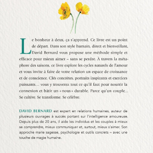 Le bonheur à deux, ça s'apprend. Ce livre est un point de départ. Dans son style humain, direct et bienveillant, David Bernard vous propose une méthode simple et efficace pour mieux aimer – sans se perdre. À travers la métaphore des saisons, ce livre explore les cycles naturels de l'amour et vous invite à faire de votre relation un espace de croissance et de conscience. Clés concrètes, portraits inspirants et exercices puissants... vous y trouverez tout ce qu'il faut pour nourrir la connexion et bâtir un « nous » durable. Parce qu'un couple... Se cultive. Se transforme. Se célèbre.
