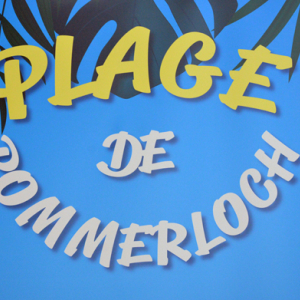 Sous la surveillance des parents visitant le centre commercial, les enfants jouent sur la plage de Pommerloch au Luxembourg devant une fresque monumentale réalisée par Jean-Marie Lesage. L'entrée est gratuite.