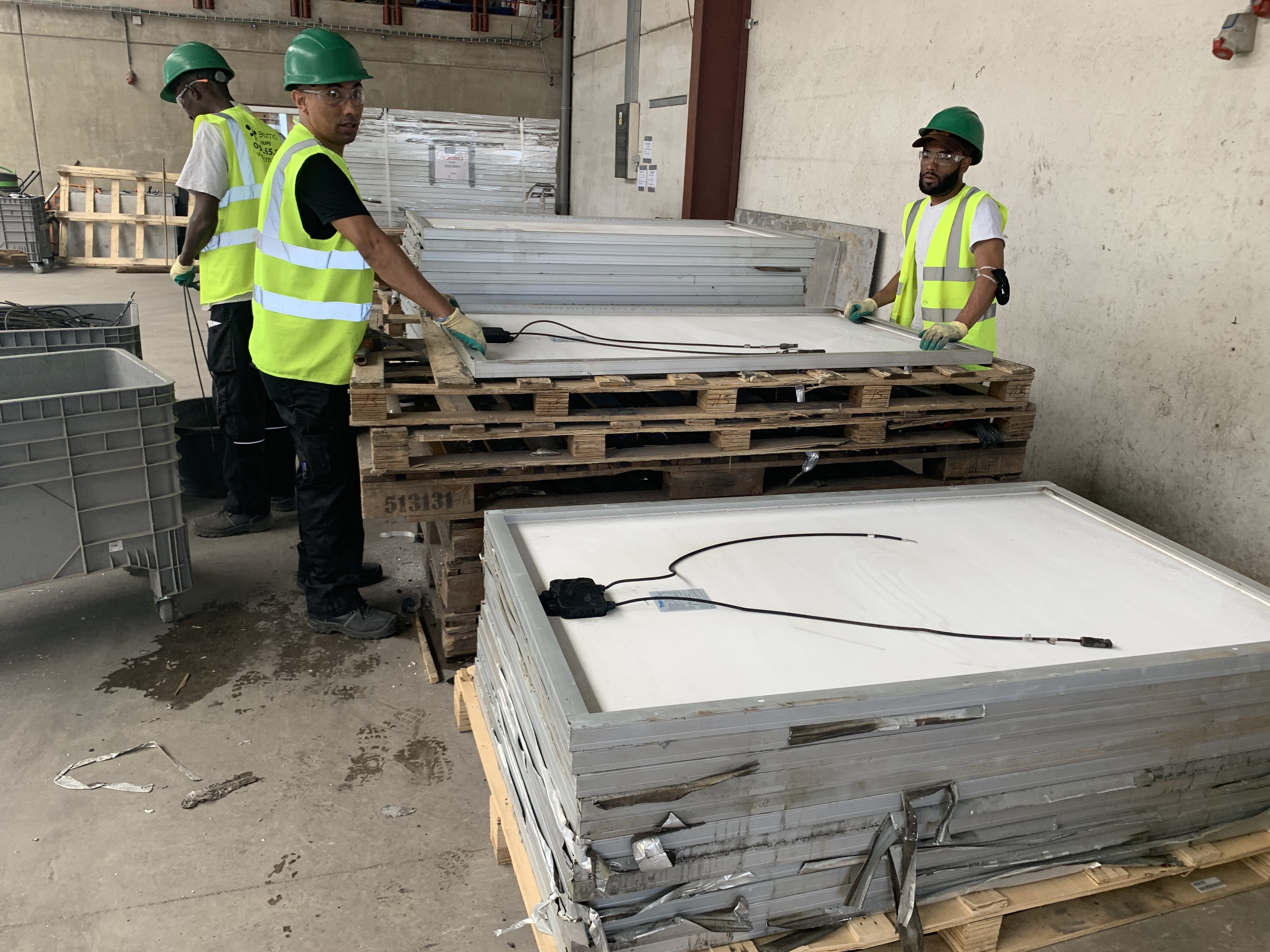 La première opération consiste à rassembler les panneaux et à les démonter suivant une méthodologie bien particulière. Recma, basée à Seraing, assure cette première opération. Claudel Guitard, Directrice de Recma : « Nos équipes – pour partie dans une démarche d’insertion professionnelle - démontent tout ce que l’on peut enlever à la main et à l’aide d’une machine-outil conçue sur mesure : c’est à ce stade qu’on récupère le cadre en aluminium (13 à 15% du PV) et la connectique, qui recèle du câblage en cuivre et autres métaux précieux (3-4% du PV). La suite se passe chez COMET ». La feuille du panneau, constituée de verre (jusque 75%), d’une backsheet de plastique (5 à 10%) et des gaufrettes contenant ici encore du cuivre, de l’argent mais aussi du silicium, prend alors la direction du Groupe COMET : le site de Châtelet pour une première opération de fragmentation et ensuite Obourg (Mons) où les différentes matières sont séparées en vue de leur valorisation.