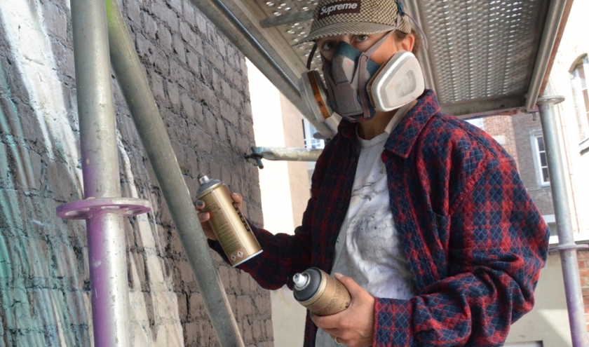 L’artiste Adele Renault, artiste liégeoise vivant à Los Angeles termine sa fresque commencée ce dimanche à Liège dans le cadre d’ART PUBLIC LIEGE. Elle peint un pigeon monumental Rue de l’Etuve à Liège.
