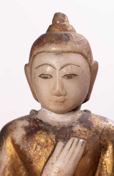 Si le Bouddha assis, sur un lotus, est bien connu, on en découvre de multiples versions – couronné, ascète décharné ou enfant joufflu – créées en albâtre, bois, bronze, céramique, cuivre, ivoire, lapis lazuli, schiste, … Parcourant cette exposition, voyageant du XIVè au XXè siècle, à la vue de représentions des plus humbles aux plus travaillées, nous découvrons quelques postures codifiées, comme le bouddha debout, marchant, couché (rendu célèbre par le fameux « Wat Pho » ou « Temple du Bouddah couché », de 46 m de long et 15 m de haut, édifié en 1788, à Bangkok), …