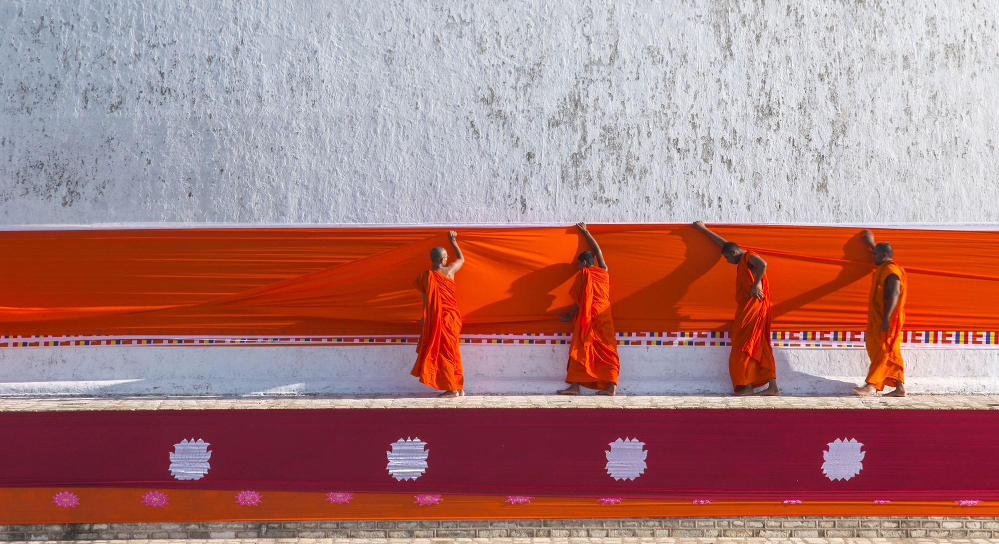 ** Avant d’accéder à l’exposition, avec l’aimable autorisation du « National Museum of Asian Art, Smithsonian Institution« (Washington D.C.), nous pouvons assister à la projection d’une installation vidéo immersive (accessible gratuitement) du réalisateur Stanley Staniski : « The Texture of Practice : Sri Lanka’s Great Stupa », nous invitant à vivre, en 15′, une journée de culte au pied du Stupa sri lankais « Ruwanwelisaya » (édifié en 140 avant notre ère/ 103 m de hauteur/renfermant des reliques corporelles du Bouddha historique), ce site dégageant une puissance émotionnelle hors du commun.