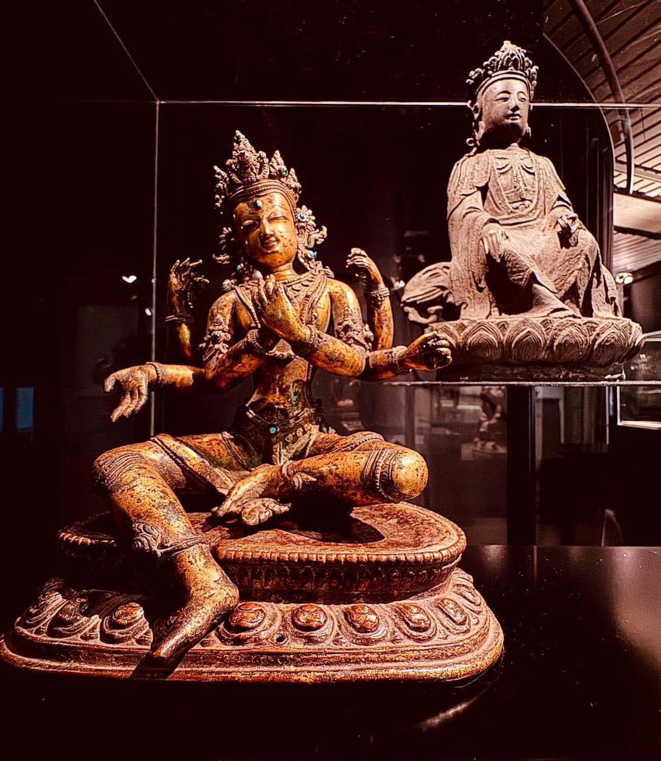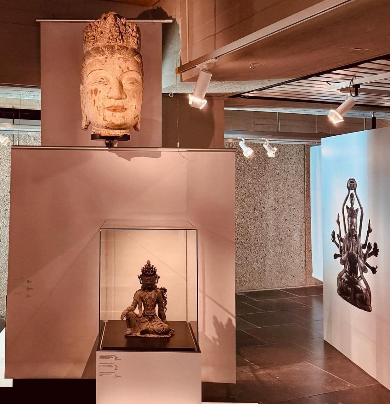 Dès notre entrée dans le grand hall du « Musée royal de Mariemont », nous sommes accueillis par une oeuvre remarquable, en bronze, une statue du bodhisattva « Avalokitesvara », figure bouddhique monumentale, dite « aux mille bras », considérée, à l’époque de sa commande par Raoul Warocqué, en 1910, comme ayant été fabriquée au Japon, qui, suite à une étude d’experts, est, désormais, identifiée comme étant une création chinoise remontant à la dynastie Ming (1368 à 1644).