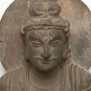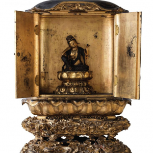 Ainsi, en vue de cette exposition, dès 2023, une série d’opérations de restaurations fut entreprise, sous le contrôle d’experts scientifiques, 23 pièces ayant ainsi été restaurées, dont une pièce en bois laqué : la statue du Bodhisattva Avalokiteshvara et son autel. Si la statue avait déjà été restaurée, en 2006, ce n’était pas le cas de l’autel et de ses socles. Ces derniers présentaient des fissures, des traces d’oxydation, d’encrassement, des soulèvements et une perte de dorure. Certains éléments en bois, déformés par l’humidité, menaçaient également la stabilité de l’œuvre. Son état nécessita une campagne de restauration lourde, soutenue par le « Cercle royal des Amis de Mariemont ».