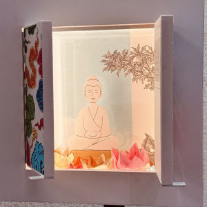 ** Notons, au sein de l’expo, un parcours intitulé « Tout un Monde », qui s’adresse principalement aux familles, mais que chacun peut utiliser. Douze petites armoires permettent d’appréhender, par des interactions concrètes, l’univers du bouddhisme. Au programme : s’essayer à des exercices de concentration, revenir sur la vie du Bouddha, comprendre la symbolique du lotus, en réalisant un origami ou encore découvrir les quatre nobles vérités, avec la roue du « dharma ».