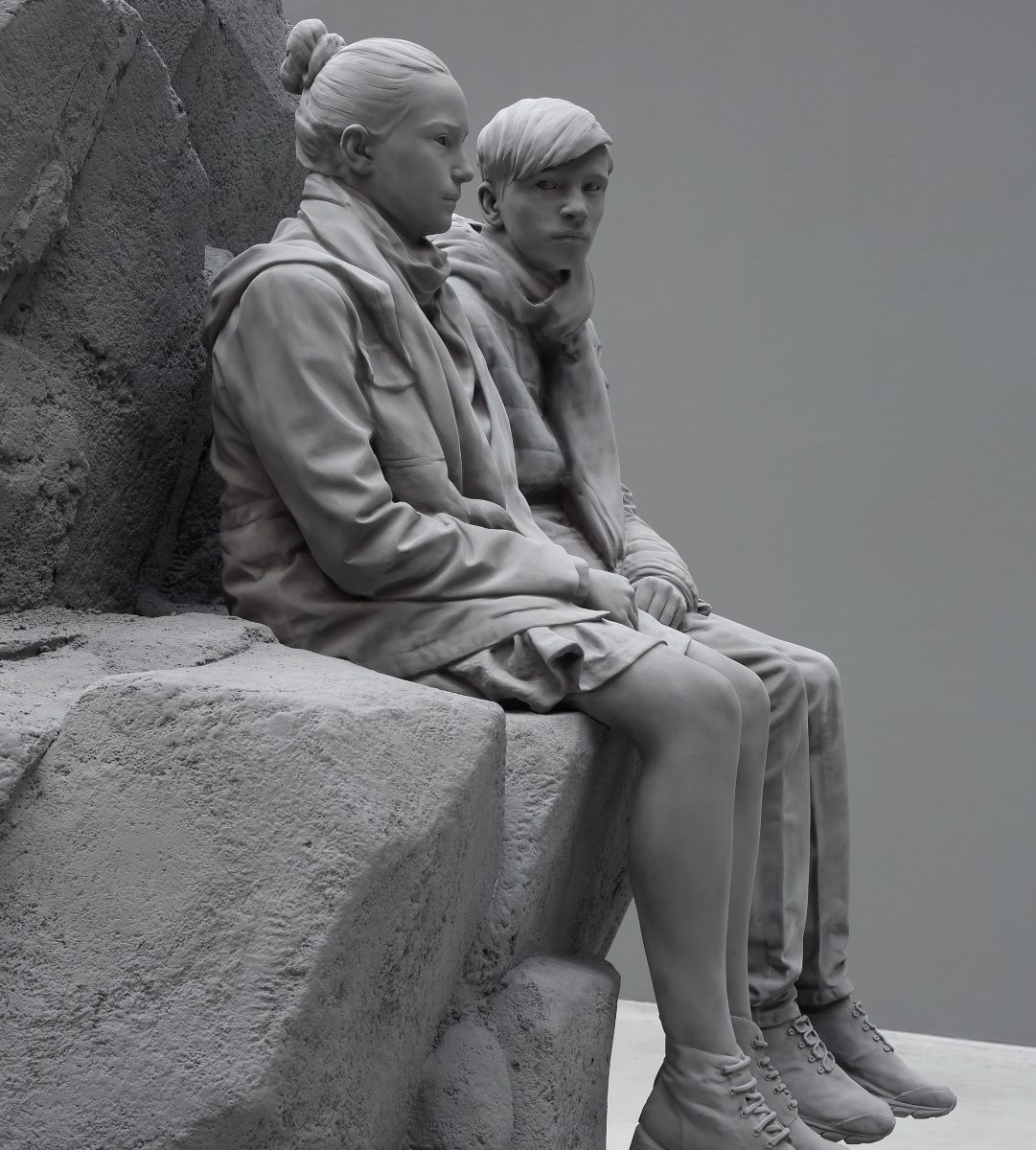 « Miriam » (2024), en robe longue, nous accueille, avec une chouette posée sur sa main droite, dans la dernière salle de sculptures. Une épingle traversant l’un de ses sourcils, elle est coiffée à la « punk », Derrière elle, nous trouvons un immense rocher sculpté, un couple d’adolescents, « La Falaise » (2019), étant assis à l’autre extrémité de ce rocher, le jeune homme posant son regard sur la jeune-fille, cette scène témoignant des premiers, intenses mais fragiles, émois amoureux. Enfin, un garçon, accroupi, joue aux billes, « Timo (Billes) » (2019), alors que, proche de lui, nous retrouvons la jeune-fille qui nous a accueilli, avec une bulle de savon, ayant, cette fois, un papillon, délicatement posé sur l’index de sa main droite, d’où l’intitulé de cette sculpture : « Tatiana (Papillon) » (2017), Le parcours s’achevant avec ses deux jeunes et ses deux enfants, la boucle est, ainsi, bouclée, … au niveau des sculptures …