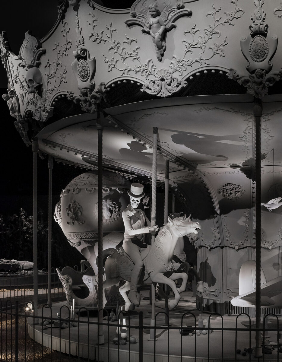 … Et voici, figé dans une immobilité glacée, ce carousel aux chevaux de bois, sculptés dans une autre matière, avec un seul enfant, debout, tenant en laisse un … dauphin, mais avec de curieux adultes, telle cette dame à l’ombrelle, ce cavalier, en haut de forme, ou encore un clown fumeur, assis dans son carrosse, devant son quartier de gâteau et son verre de vin, tous trois étant des … squelettes, … qui, en 3D, nous rappellent l’un des univers de Paul Delvaux (1897-1994) ou de James Ensor (1860-1949), à moins que cette scène n’évoque la joyeuse « Fête des Morts », chère à nos amis Mexicains. Quoi de plus normal que le titre donné à cette installation : « Danse Macabre » (2021).