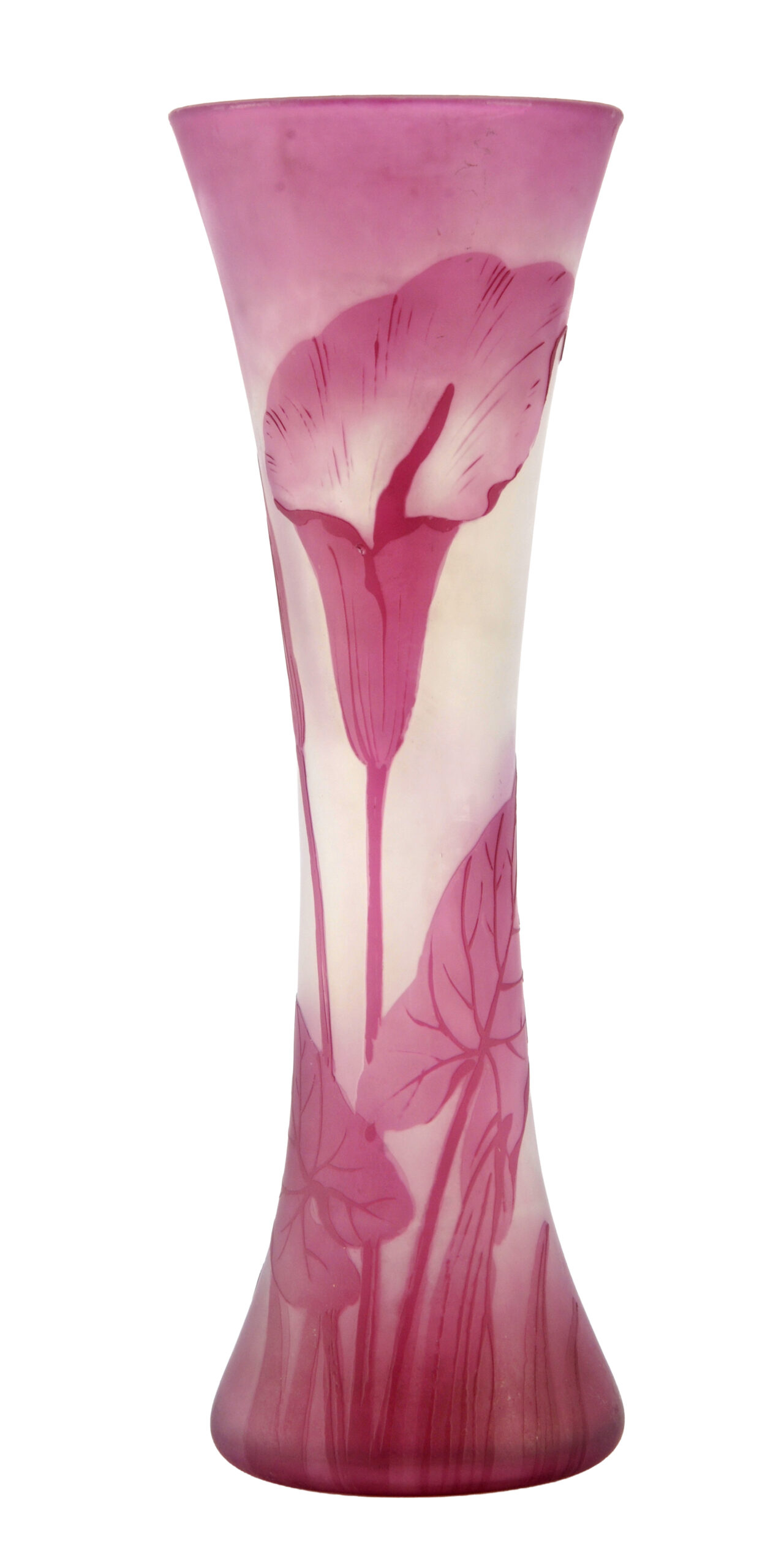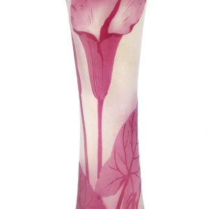 Deux autres vases créés par Léon Ledru attirent notre attention. D’une part, le modèle « Jonghen » (1897), en cristal soufflé, gravé à la roue, dont le corps, longiligne et légèrement cintré, se développe, avec élégance, avant de s’ouvrir en trois lobes, sur le bord supérieur. d’autre part, un modèle cylindrique « à effigie féminine » (1899), en verre multicouche soufflé, gravé à l’acide, combinant le violet, le jaune souffre et le vert jaunâtre, représentant un buste féminin, typique du style des affichistes de l’ « Art nouveau ».