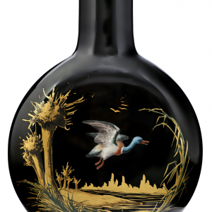 Parmi les oeuvres exposées, témoignant du « Japonisme », notons un joli vase, avec un haut col cylindrique – décoré d’un paysage peint à l’or, surmonté par le vol d’un canard émaillé – réalisé, vers 1880, en verre hyalite, un verre noir opaque soufflé, à l’éclat intense, dont la formule a été mise au point en Bohème.
