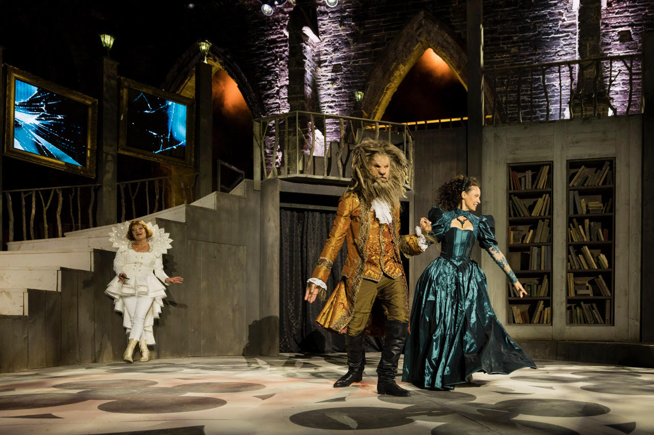 Ce spectacle se déroule sur deux scènes : la scène principale, cadre des premier et troisième actes, implantée au côté nord de l’église abbatiale, représentant le château de la « Bête » et une scène secondaire, implantée dans le  cloître, représentant la maison du père de la « Belle« , qui, lors de ce second acte, sera rejointe par ses deux soeurs , Fatmé & Lisbé, un entracte étant prévu avant de rejoindre la scène principale.